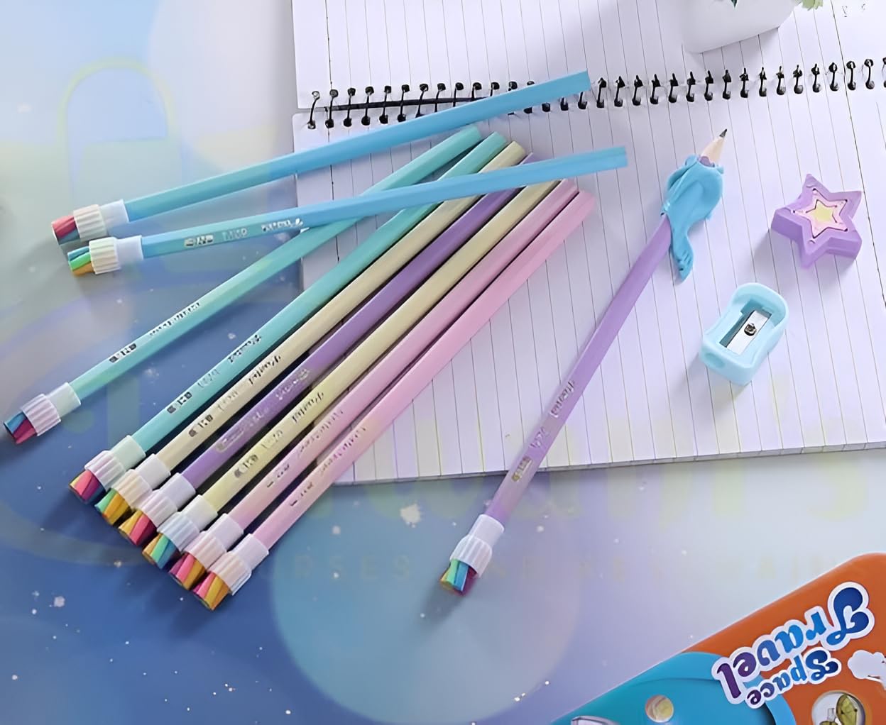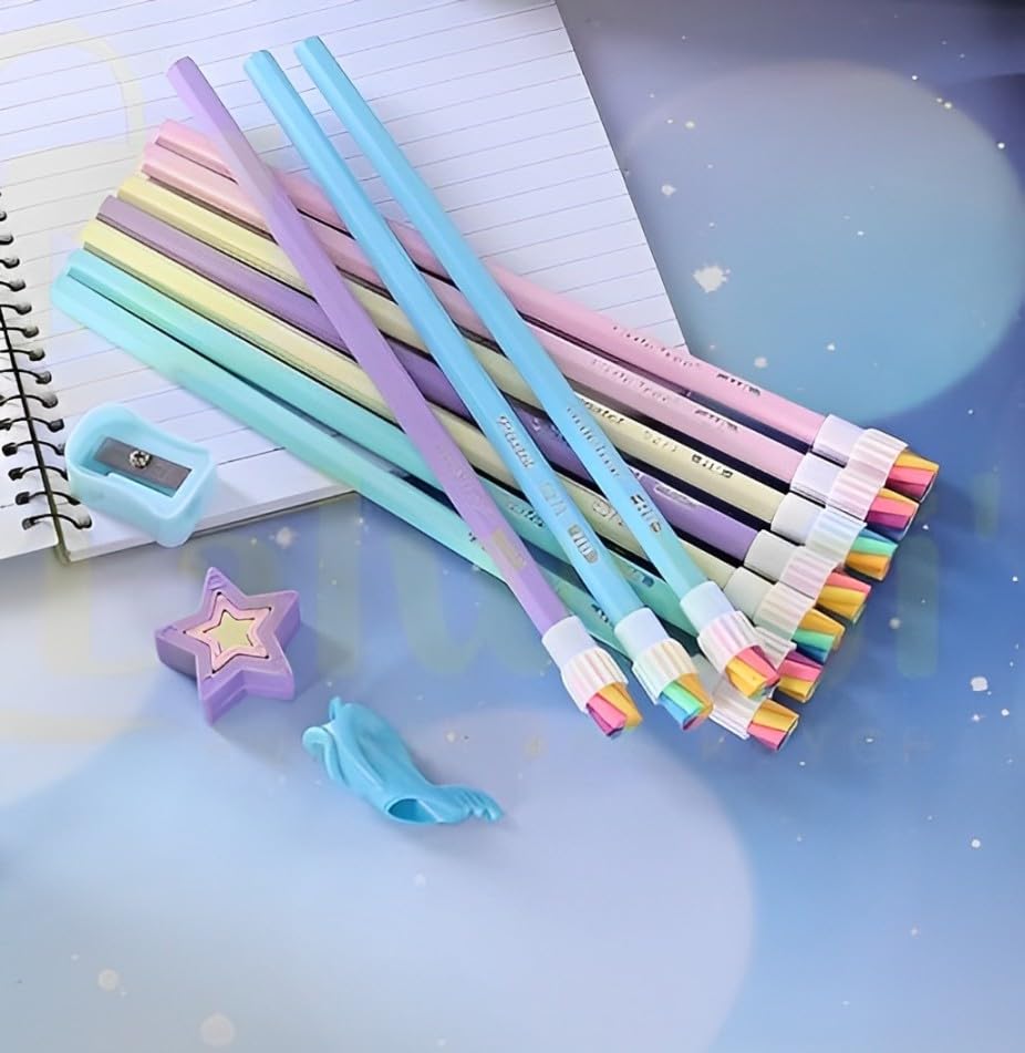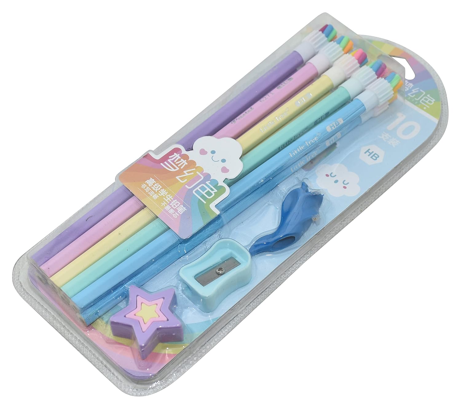 Rainbow Theme Stationery Set – HB Pencils with Erasers & Sharpener (Set of 10)